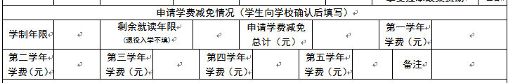 3.申请学费减免情况需要学生向学校财务处确认后填写。“剩余就读年限”指“学制年限减去入伍前已读年限”;“申请学费减免总计”填写剩余年限学费总和,后面每学年学费从第一学年开始填写。如学制4年,大一读完应征入伍,剩余年限读3年,分别填写第一学年、第二学年、第三学年。