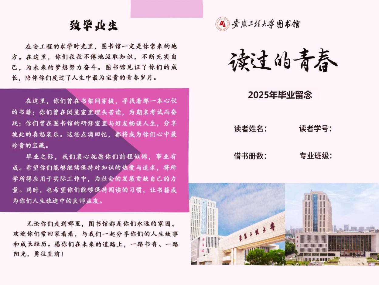时间如流水,潺潺逝去,又到了一年毕业季,我们在安工程认识的每个人、经历的每件事、每一次的情绪波动起伏,都将会是以后无可替代的青春回忆。在安工程的求学时光里,图书馆一定是你常来的地方。在你即将毕业,离开母校的时候,图书馆为2025届毕业生提供阅读书单纪念卡制作的服务。启程时,带上你的阅读历史,奔赴各自不同的人生,一鸣从此始,相望青云端。